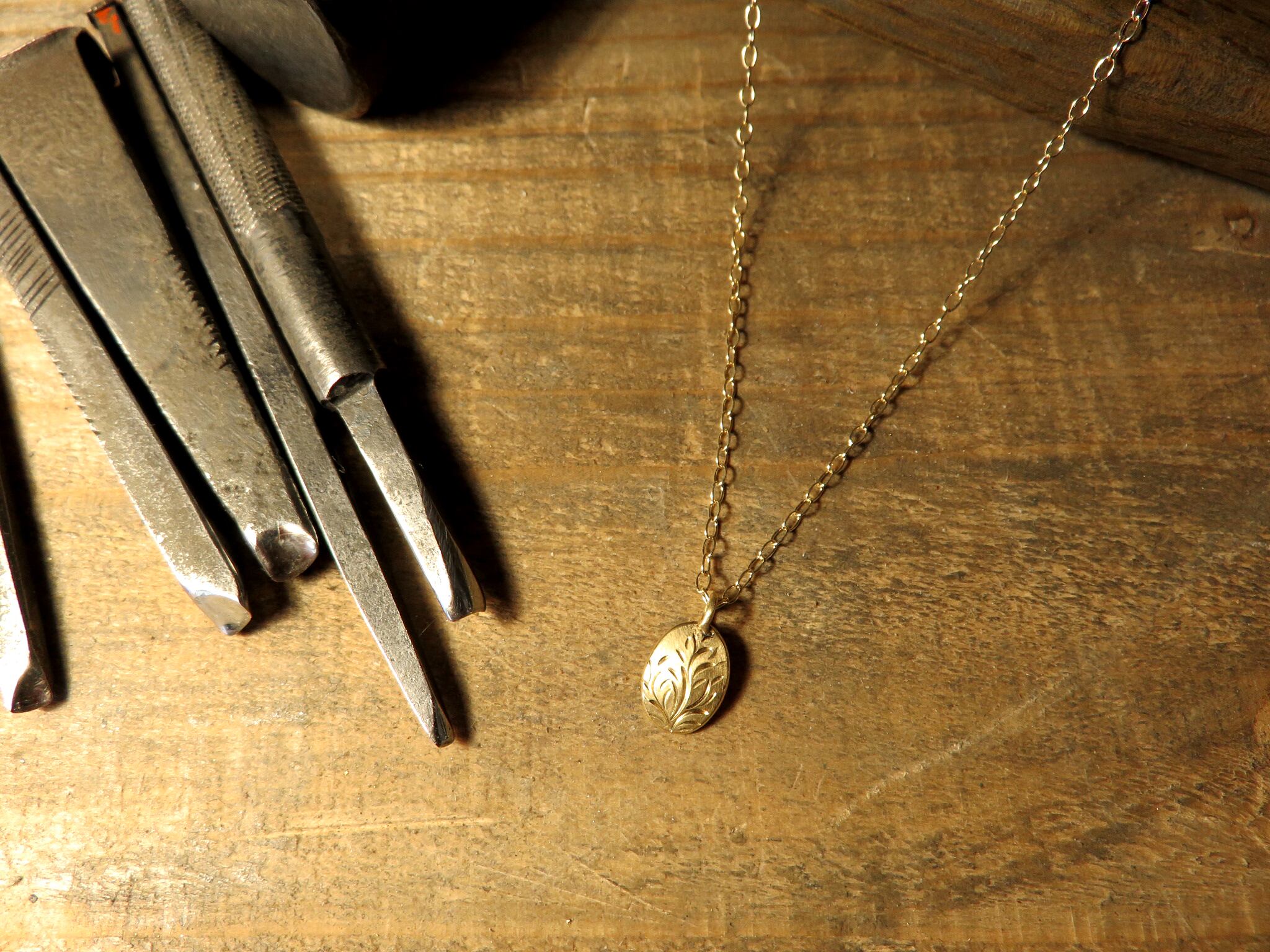 18金ゴールドのチェーンと、繊細に細工されたペンダントトップが胸元をさりげなく引き立ててくれます。