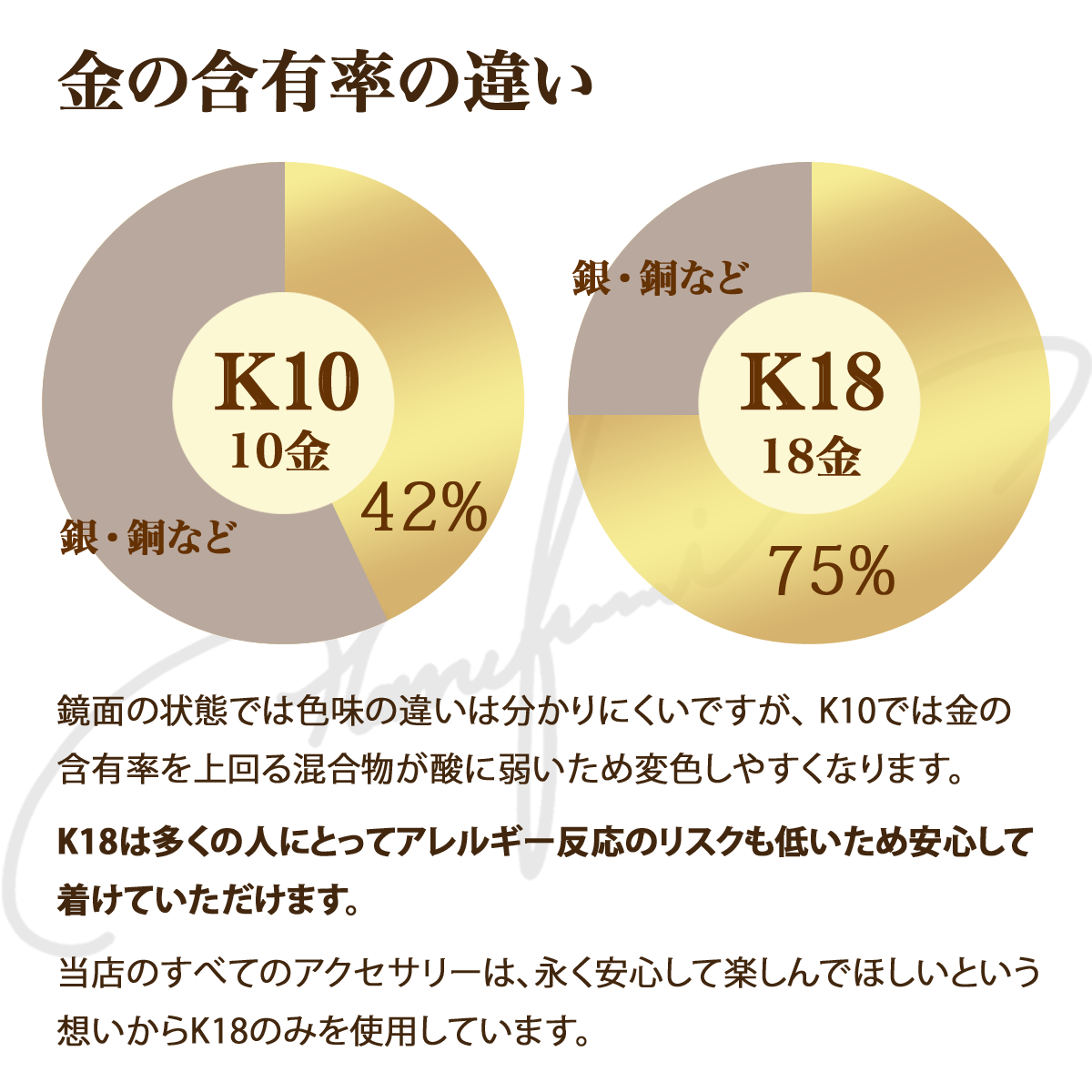 変色しにくく、金属アレルギー反応を起こしにくいK18(18金)ゴールドでお作りしています。