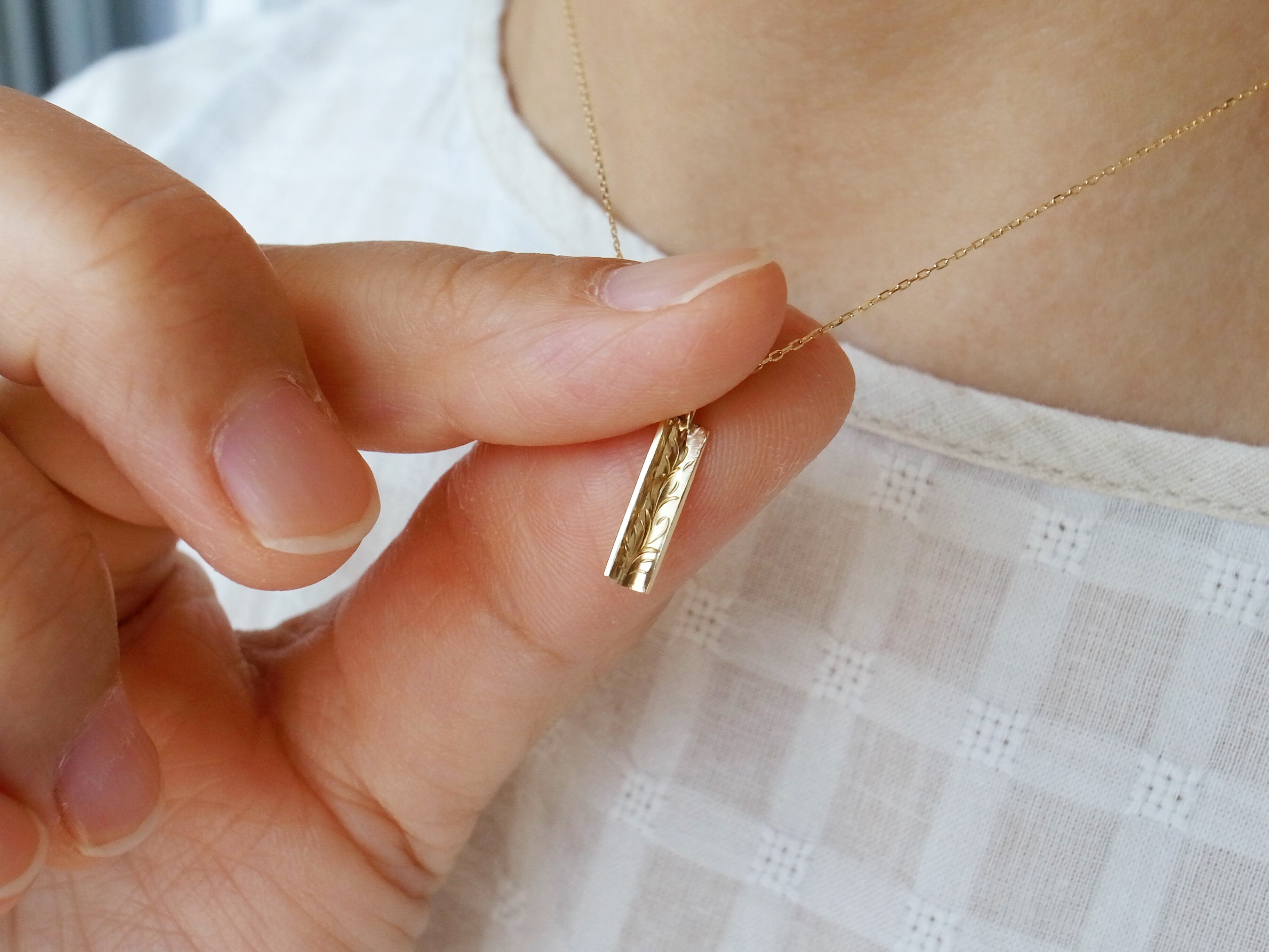 18金ゴールドの華奢なチェーンと、繊細に細工されたペンダントトップが胸元をさりげなく引き立ててくれます。