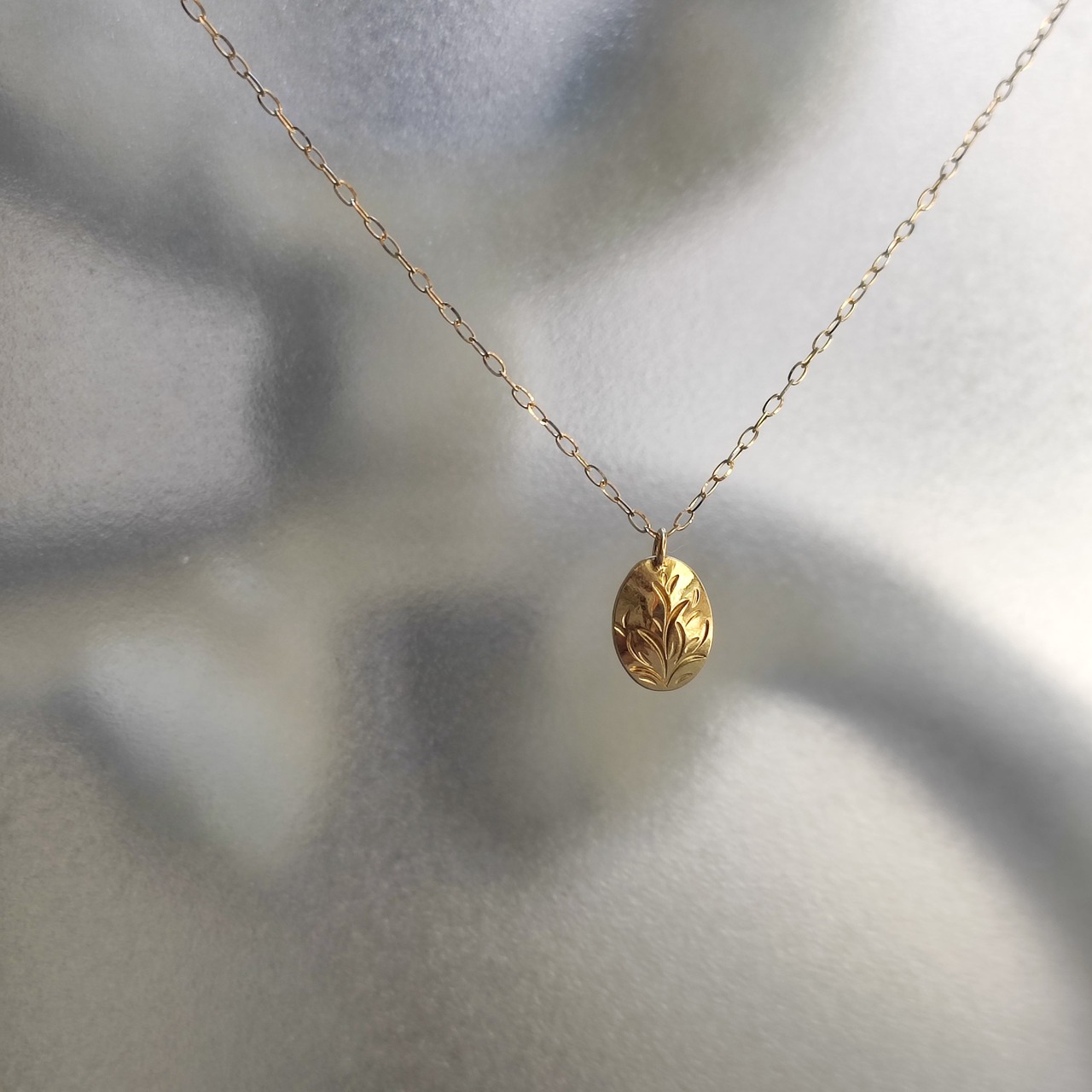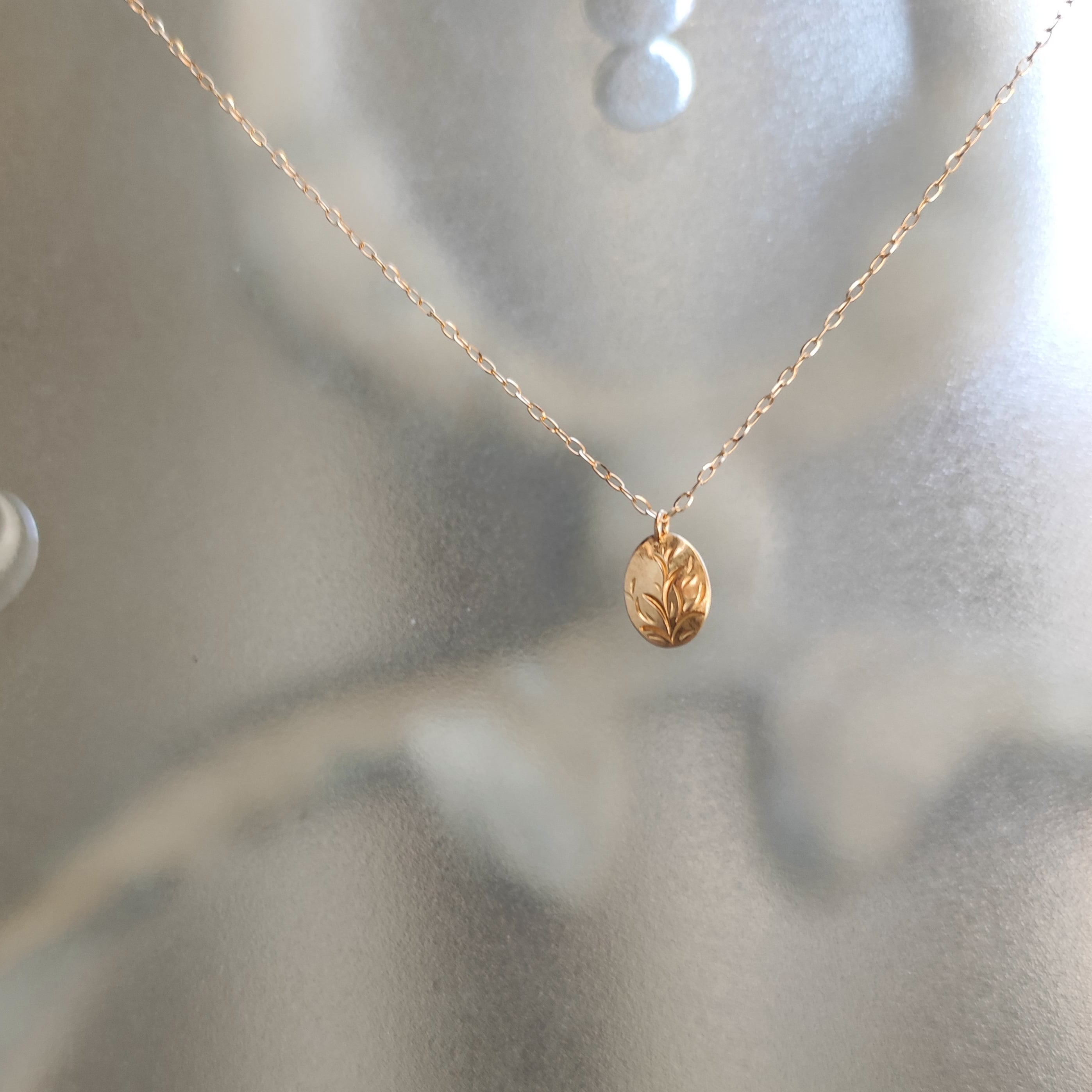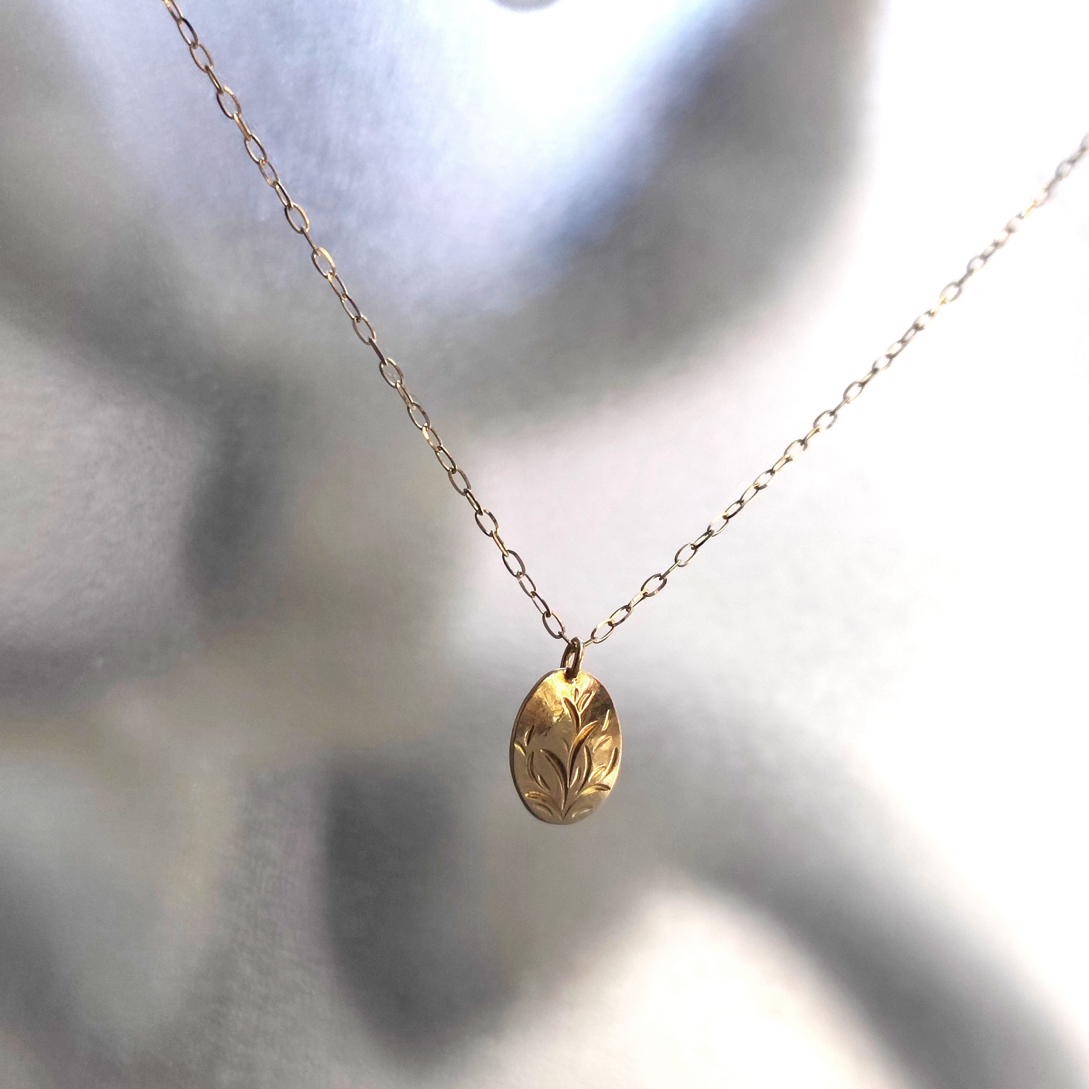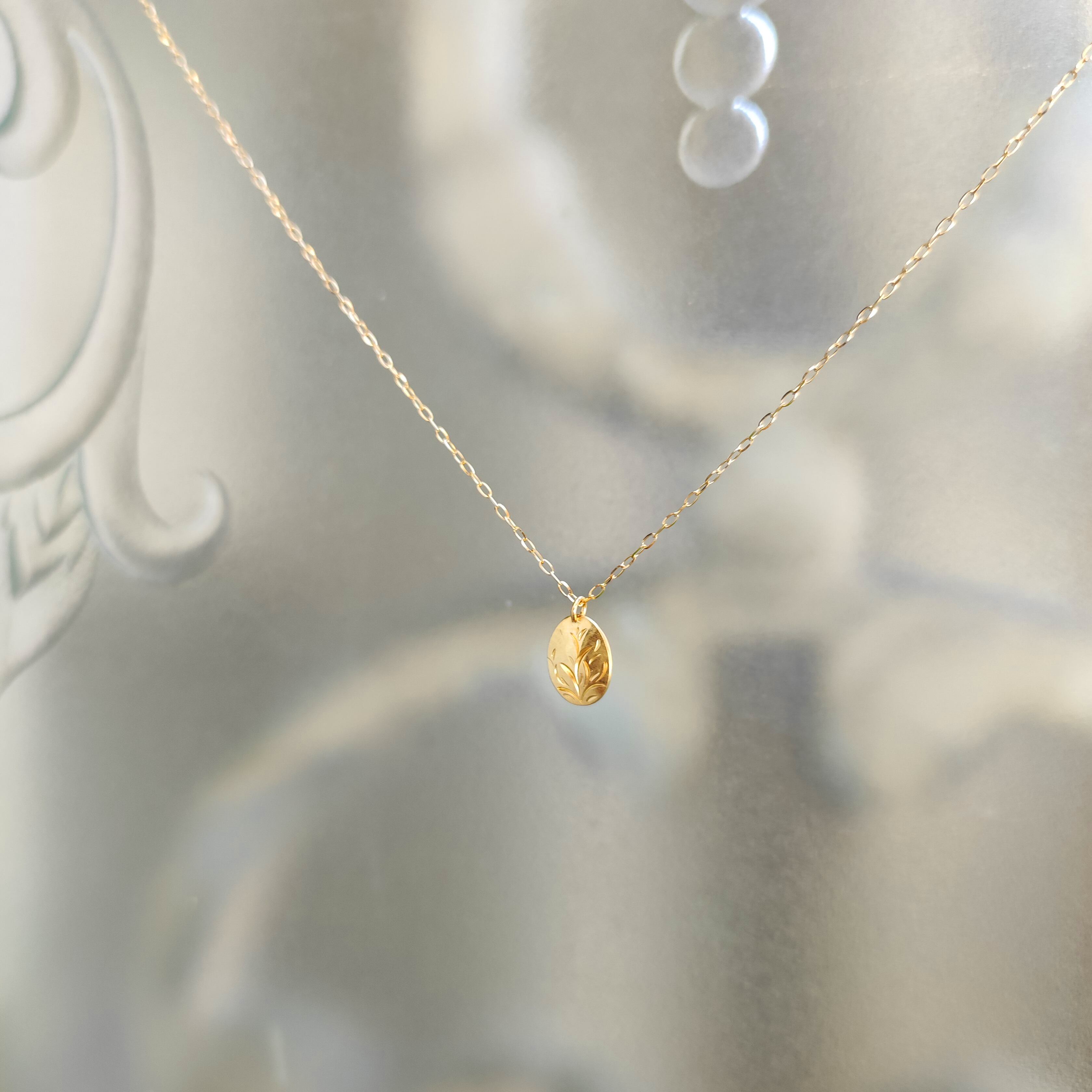 18金ゴールドの華奢なチェーンと、繊細に細工されたペンダントトップが胸元をさりげなく引き立ててくれます。