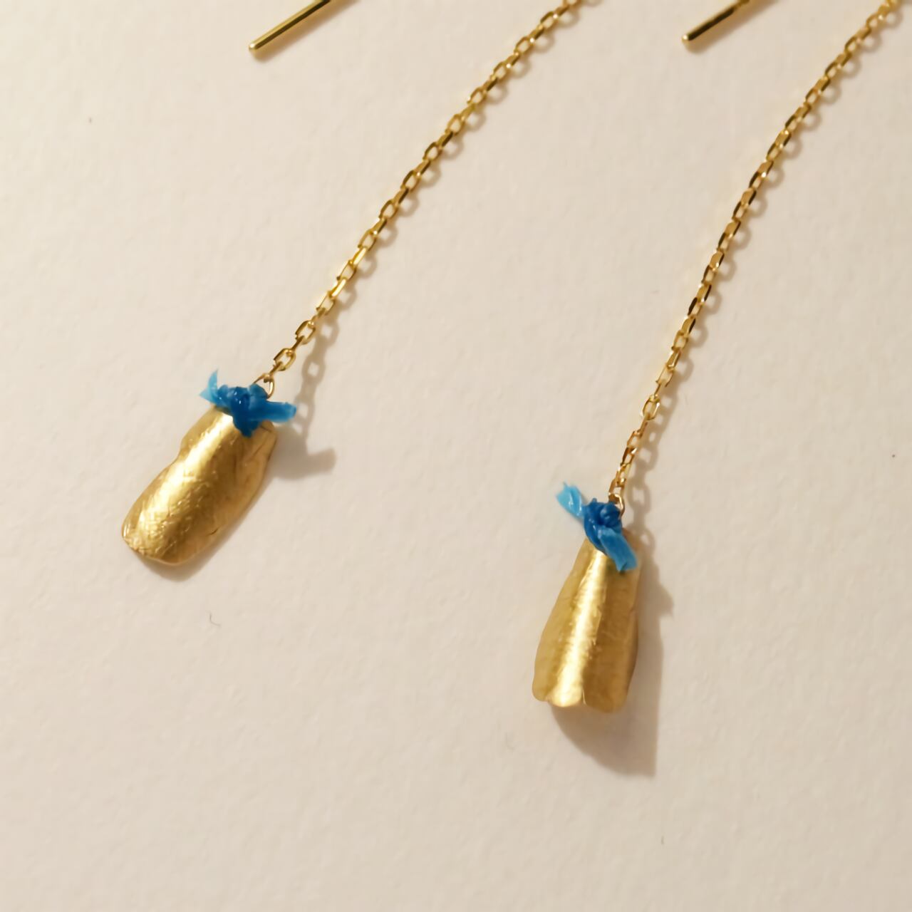 K18金ゴールドロングピアス:ロール(M) Blue * Gold Earrings