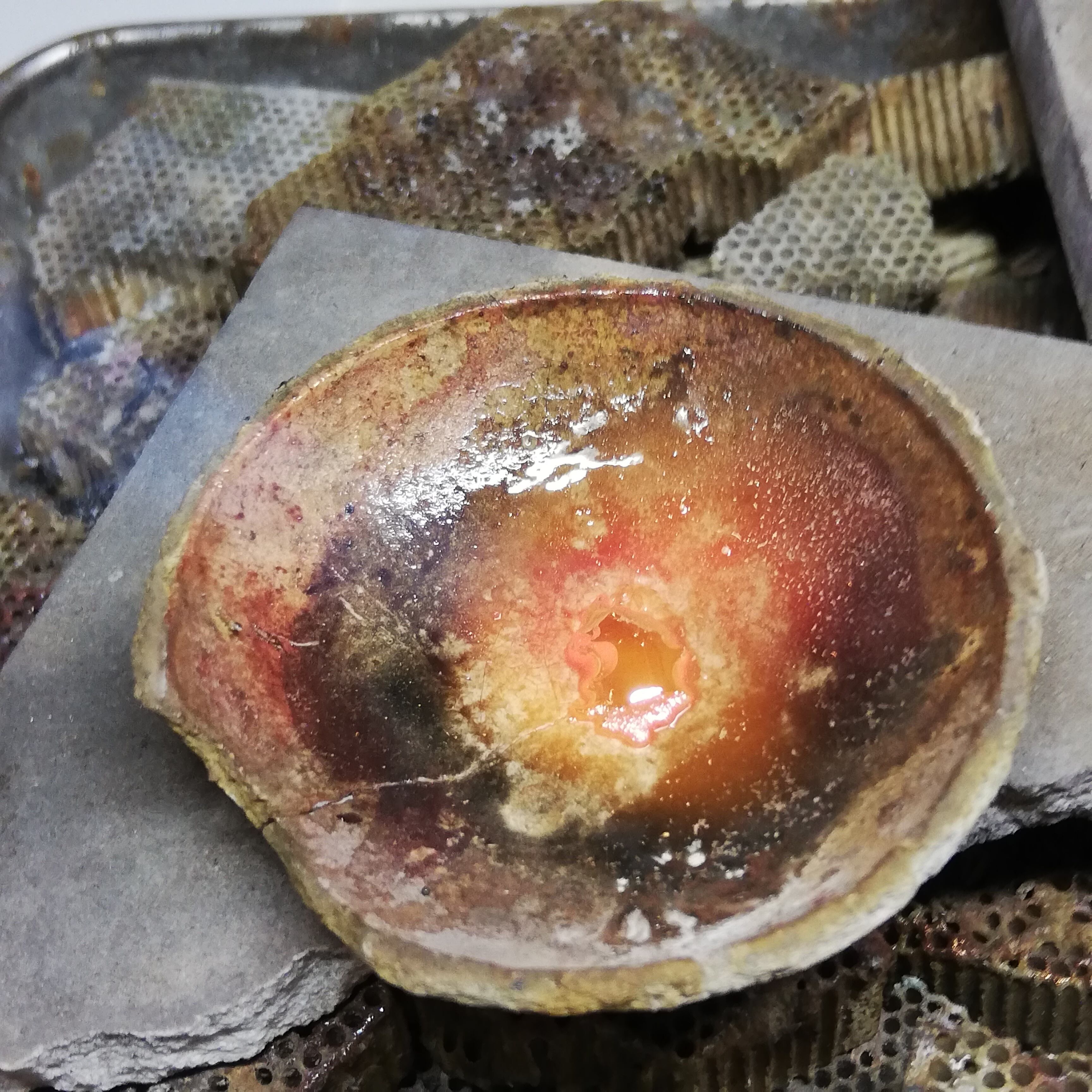 それよりも手前の溶け始めて かけらが繋がりだし常に流動するゴールドを作家の感覚で炎を操り誘導します。